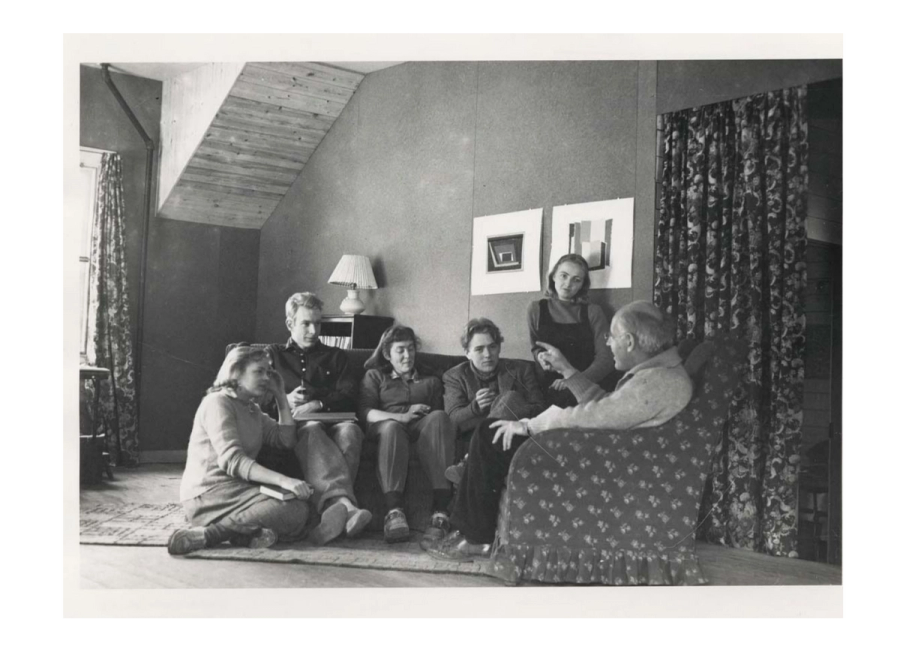 Psychology class at Black Mountain College, ca. 1942-1943. Left to right: Mary Brett, Bob Marden, Barbara Payne, Erik Haugaard, Jackie Tankersley, Erwin Straus (Psychology and Philosophy instructor, 1938-1944). Courtesy of Western Regional Archives.